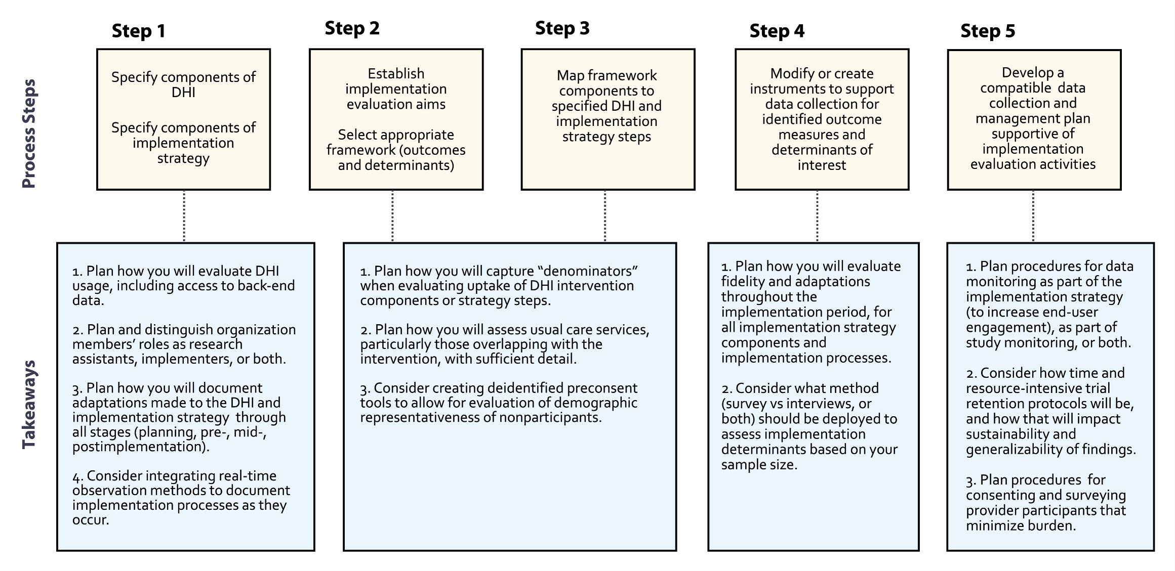 Figure 1. This figure summarizes the 5-step process to plan an implementation evaluation within a hybrid trial for prospective testing of a digital health intervention (DHI). Process steps are outlined, along with respective generalizable takeaways for research teams planning comprehensive implementation evaluations for trials testing DHIs.