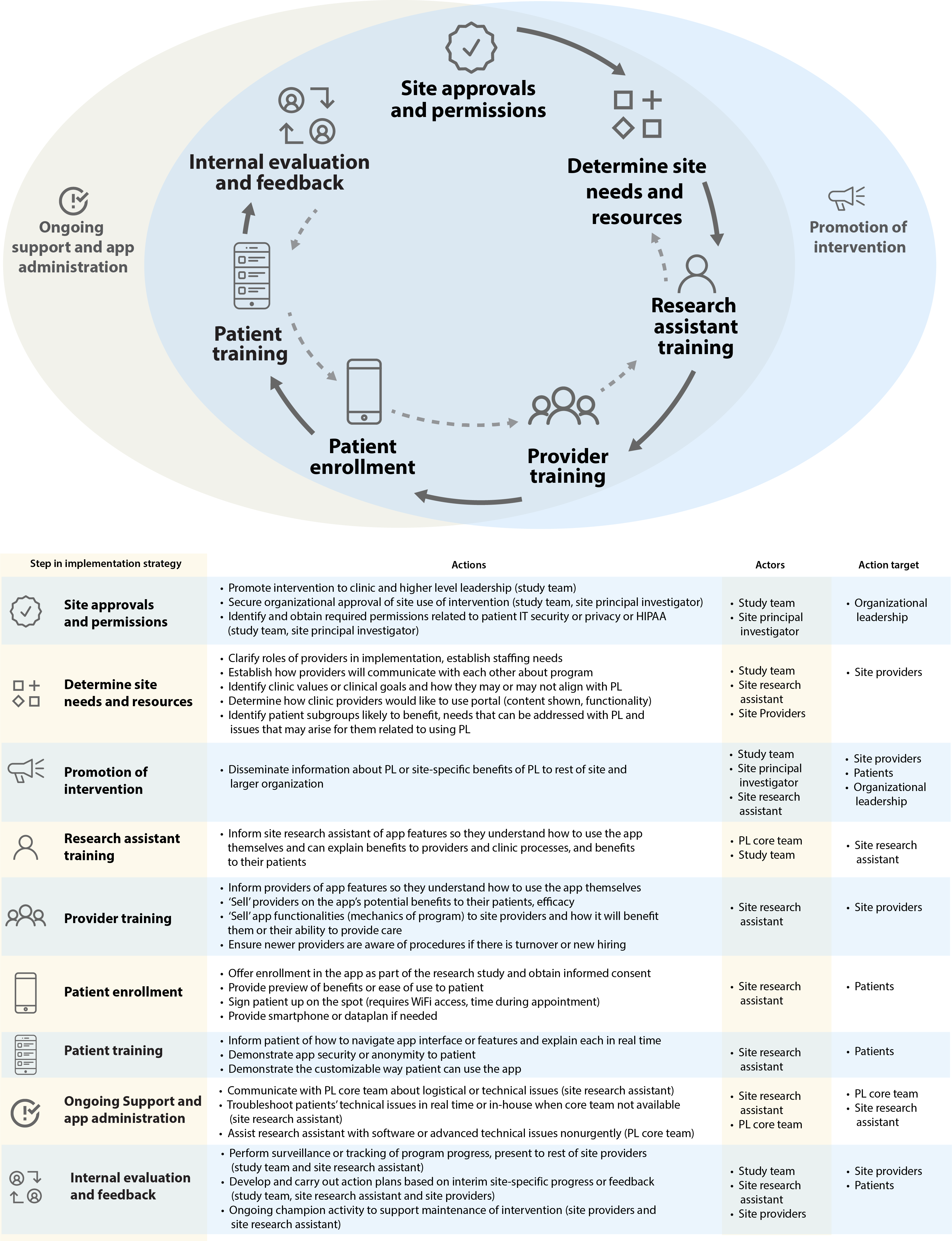 Figure 2. Discrete implementation strategy steps expected for program deployment at DC Cohort sites are demonstrated in the figure and described, specified by step, actions, and actor in the table below it. The arrows show the sequential nature of the activities, but also note the gray dotted arrows indicate the iterative nature of using evaluation and feedback to inform various process steps as implementation proceeds. HIPAA: Health Insurance Portability and Accountability Act; PL: PositiveLinks