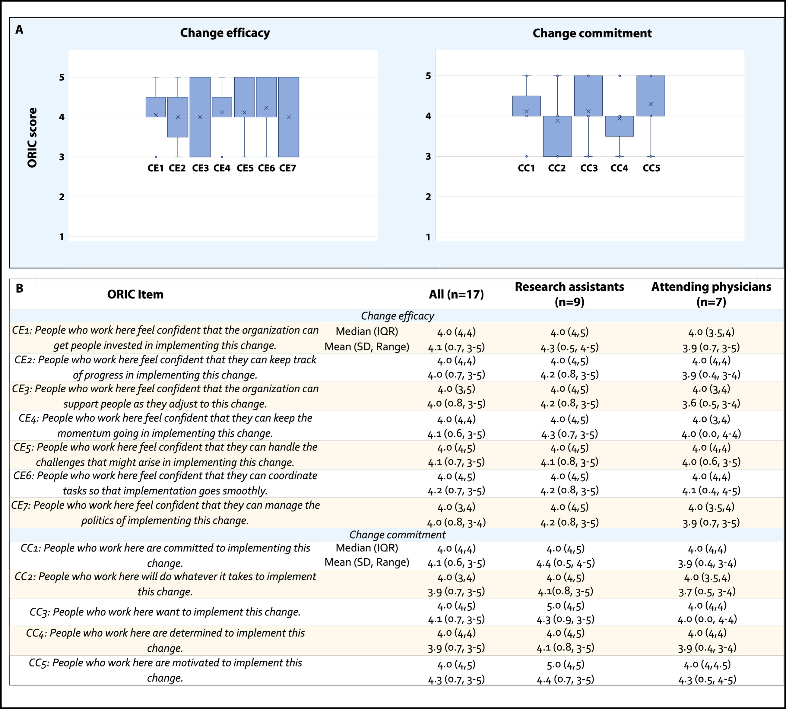 Figure 3. Baseline ORIC scores summarized for all respondents (n=17) at 6 sites randomized to implement the intervention (A) as well as by respondent type such as research assistants and attending physicians (B). One social worker completed the survey but ultimately withdrew from the program. ORIC: Organizational Readiness to Implement Change.