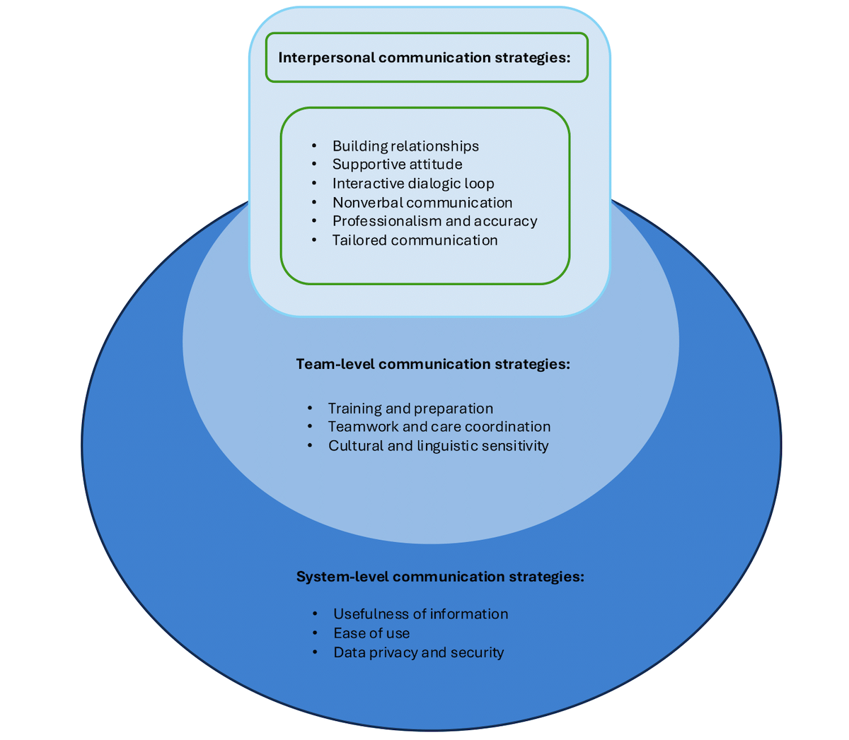 Results: This study systematically reviewed 34 peer-reviewed articles, revealing 3 overarching themes of effective communication strategies that enhance patient engagement: interpersonal communication strategies, with 6 subthemes (building relationships, supportive attitude, interactive dialogic loop, nonverbal communication, professionalism and accuracy, and tailored communication); team-level communication strategies, with 3 subthemes (training and preparation, teamwork and care coordination, and cultural and linguistic sensitivity); and system-level communication strategies, with 3 subthemes (usefulness of information, ease of use, and data privacy and security). We also found that included studies predominantly used qualitative research methods, such as semistructured interviews and focus groups, to collect patient engagement data.