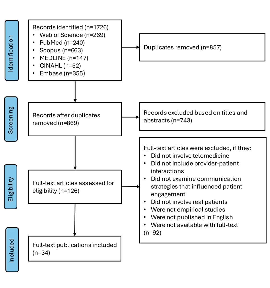 In total, 1726 articles were retrieved from 6 identified databases: Web of Science (n=269), PubMed (n=240), Scopus (n=663), MEDLINE (n=147), CINAHL (n=52), Embase (n=355). These studies were published between 1998 and 2025. After removing 857 duplicates, 869 studies remained to review titles and abstracts, and 126 studies were identified as potentially relevant documents. After the full-text review, 34 studies [39,51-83] were included in this systematic review (Figure 1). Included studies were published between 2015 and 2025, with 28/34 (82.35%) articles published after 2020, reflecting a growing scholarly focus on communication processes within rapidly evolving telemedicine practices. A list of included studies is provided in Multimedia Appendix 3 [39,51-83], and Table 1 presents primary outcomes of data extraction [50].